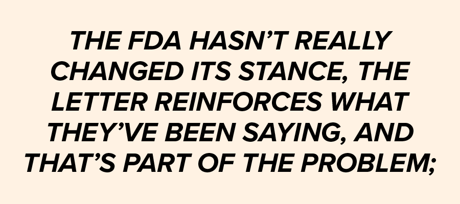 Translation? Either the FDA is only getting their information from pharmaceutical companies with vested interests in owning the right to CBD, or they did a very narrow search on NIH where there are reams of studies available (plus the fact that they’re ignoring the fact that the general population has been guzzling CBD for the better part of two years). They claimed in the letter that CBD consumption can lead to liver damage and male sex organ complications amongst other potential issues with little to no sourcing. The only source they used was pertaining to a liver damage warning from GW pharmaceuticals. The dose they were seeing liver damage at? Over 600mg of CBD per day, another important detail; when liver damage was observed patients were on other drugs at the time meaning it was not conclusively linked to a single substance.